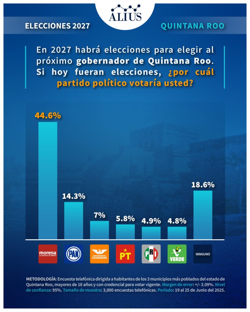 A dos años de la elección para renovar la gubernatura de Quintana Roo, los datos más recientes de Alius revelan una clara ventaja para Morena en las preferencias electorales. Si hoy fueran las elecciones, el 44.6% de los ciudadanos votaría por dicho partido, seguido por el PAN con 14.3% y Movimiento Ciudadano con 7.0%. Un 18.6% de los encuestados manifestó no preferir a ningún partido.