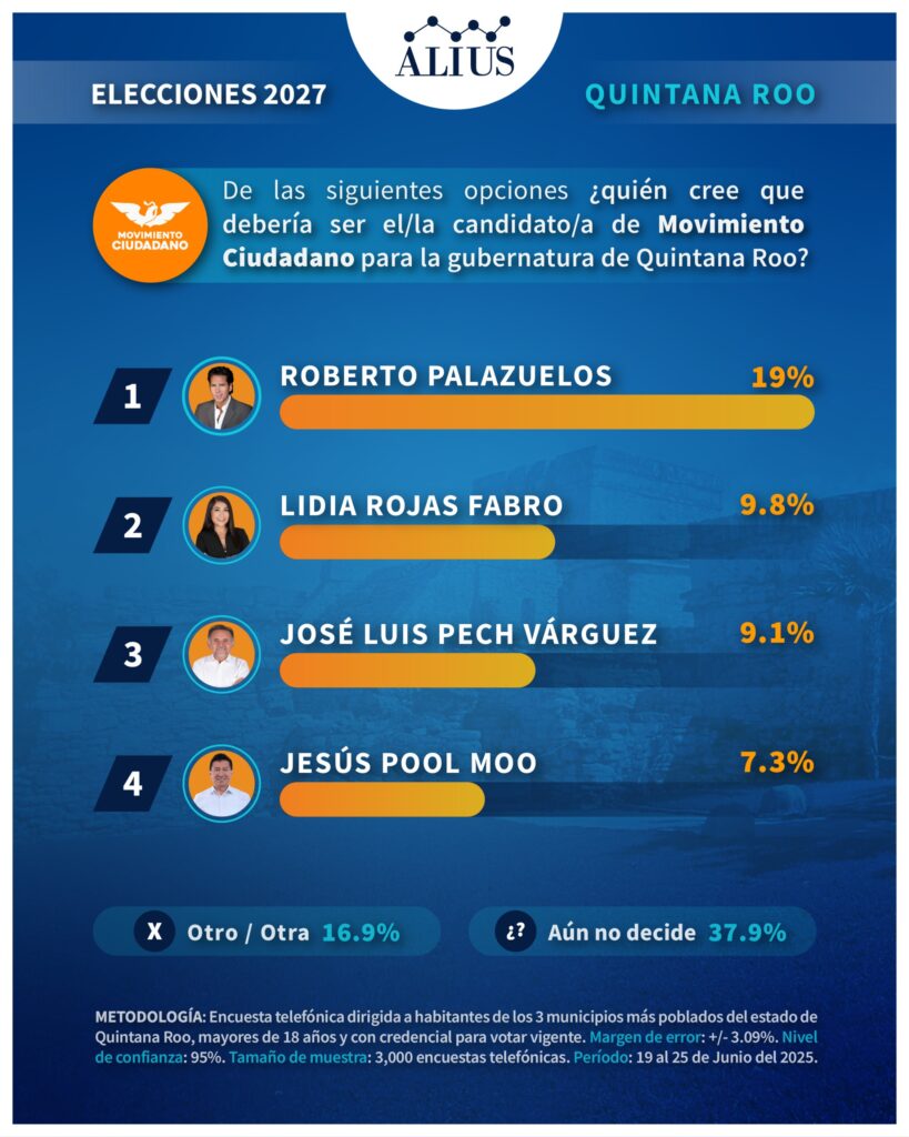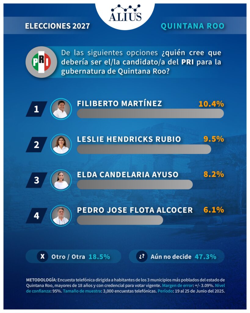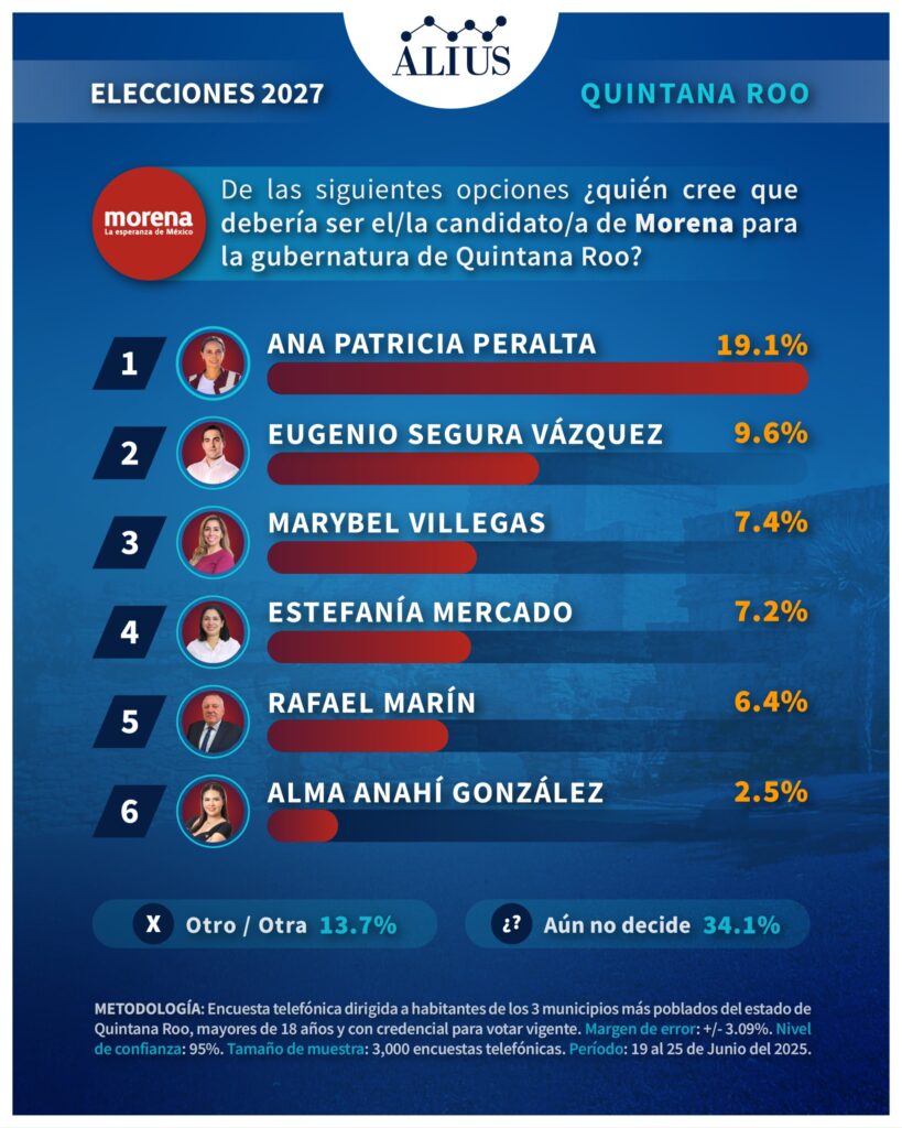En cuanto a las posibles candidaturas, Ana Patricia Peralta Peña encabeza las preferencias internas de Morena con 19.1%, aunque un 34.1% de los simpatizantes del partido aún no decide. En el PAN, Mayuli Martínez Simón lidera con 11.5%, mientras que el 47.4% de los encuestados aún no se define. Para el PRI, Filiberto Martínez aparece al frente con 10.4% en un escenario donde también hay alta indefinición (47.3%).