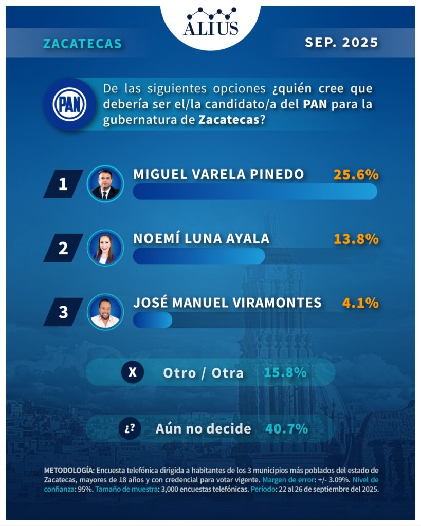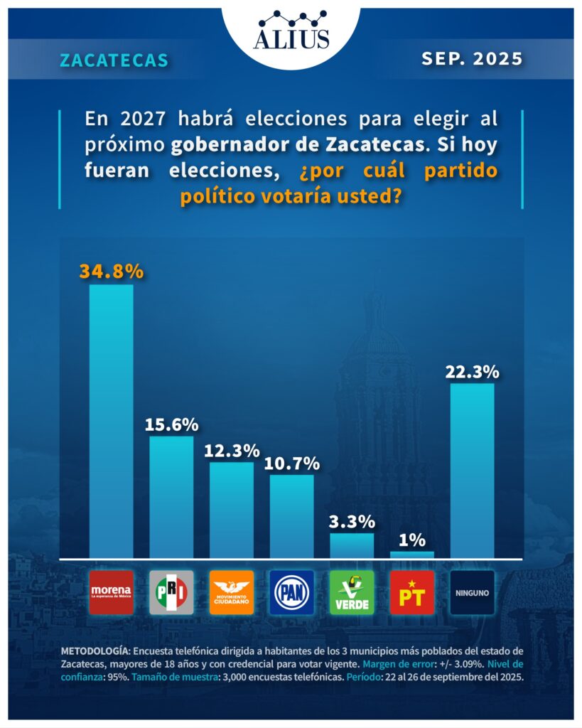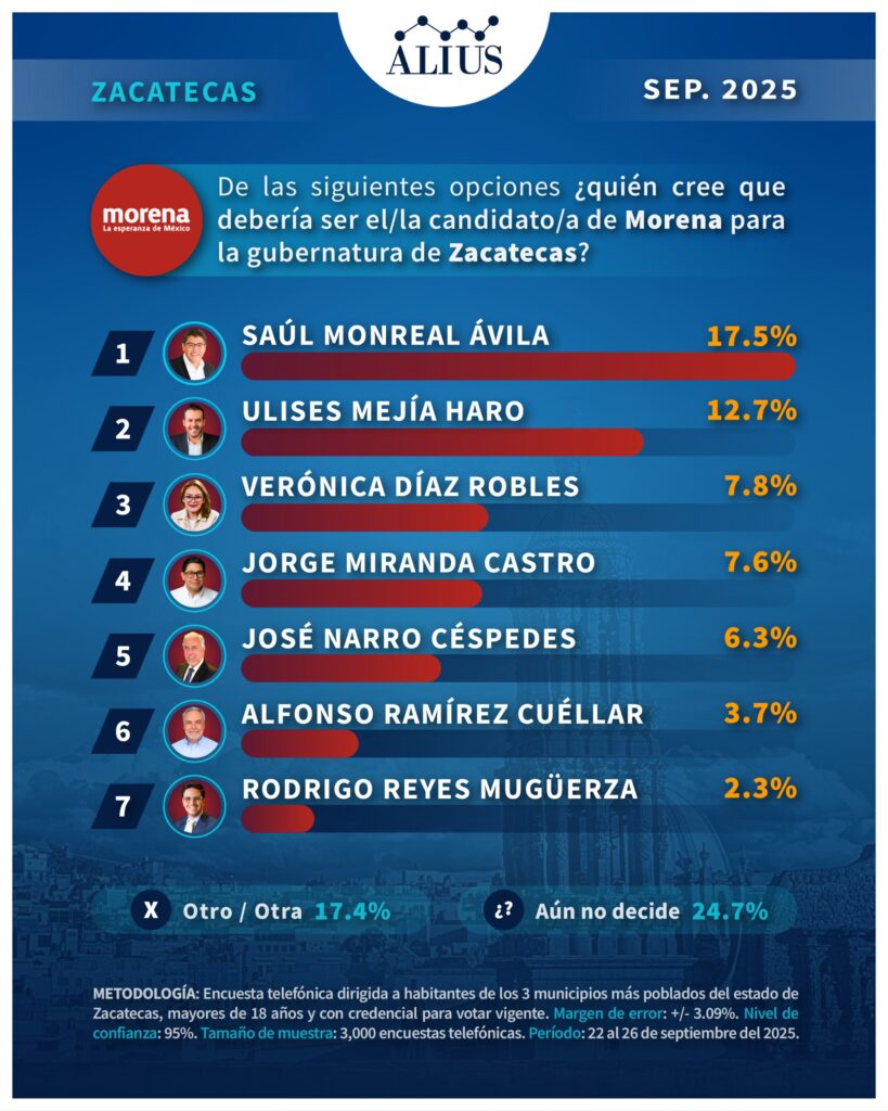 En el terreno de aspirantes, Saúl Monreal Ávila lidera en Morena con 17.5%, seguido por Ulises Mejía (12.7%) y Verónica Díaz (7.8%). En el PAN, Miguel Varela encabeza con 25.6%.