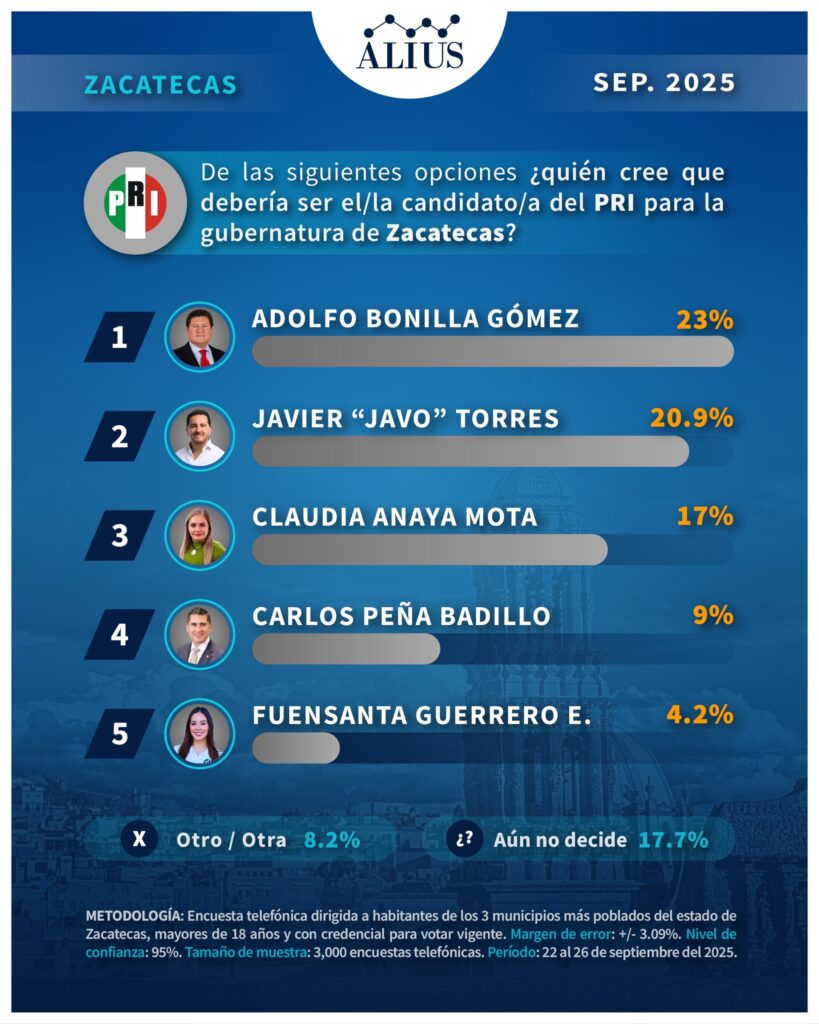 Por parte del PRI, Adolfo Bonilla Gómez registra 23.0% de las menciones, seguido por Javier “Javo” Torres (20.9%) y Claudia Anaya (17.0%).