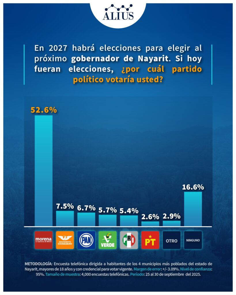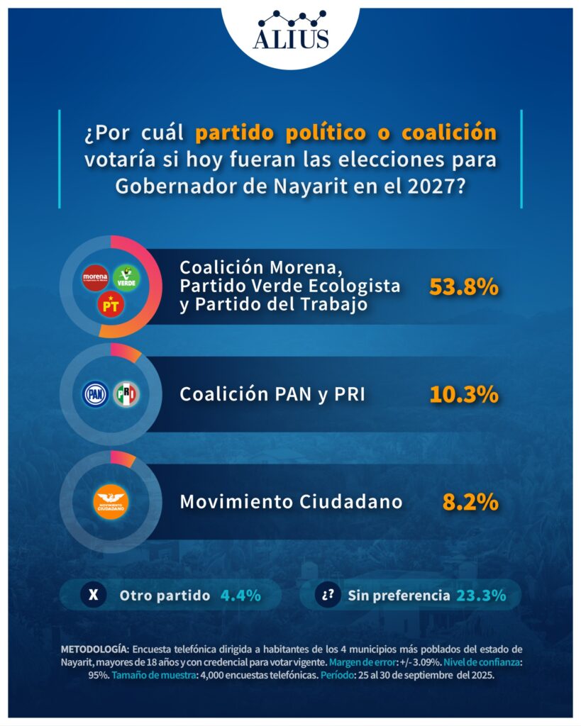 De acuerdo con nuestra más reciente encuesta estatal, la coalición conformada por Morena, Partido Verde Ecologista y Partido del Trabajo lidera ampliamente las preferencias en Nayarit rumbo a la elección de gobernador en 2027, con un 53.8% de intención de voto. Muy por detrás se ubican la coalición PAN–PRI con 10.3%, Movimiento Ciudadano con 8.2%, y otras fuerzas políticas con un 4.4%. El 23.3% de los encuestados indicó no tener aún una preferencia definida.